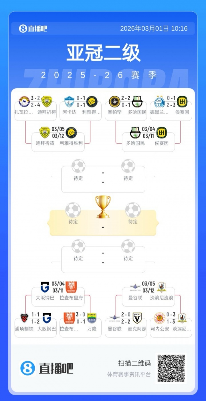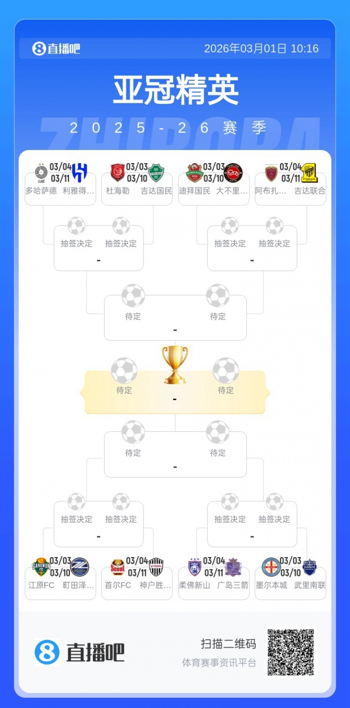 本赛季亚冠精英联赛进行到1/8决赛,原定于北京时间3月3日0点开打,西亚区对阵为多哈萨德vs利雅得新月、杜海勒vs吉达国民、迪拜国民vs大不里士拖拉机、阿布扎比统一vs吉达联合。